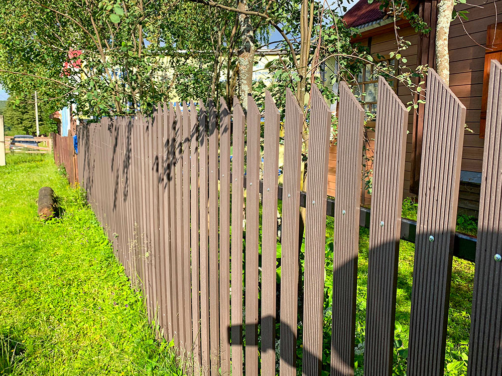 Для реализации этого проекта, нам понадобился специальный узкий полнотелый штакетник из ДПК. Ведь у владельца не так много времени посещать дачу и постоянно поддерживать деревянный штакетник в идеальной форме. Для ДПК-же такой уход не требуется и достаточно просто использовать по мере необходимости специальное средство для очистки ДПК и средство для защиты декинга. И он прослужит вам долгие годы не потребовав ничего дополнительно.
